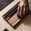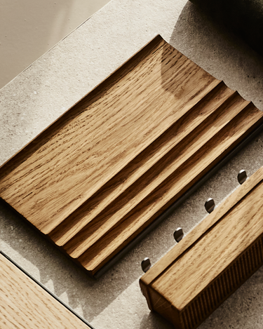 We use only natural (walnut or oak) solid wood lightly finished with wax; this produces a tactile sensory experience and gives an ideal weight balance to our products.