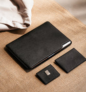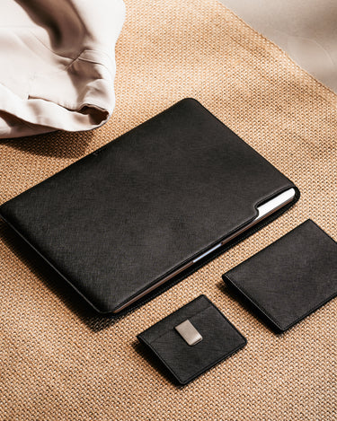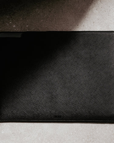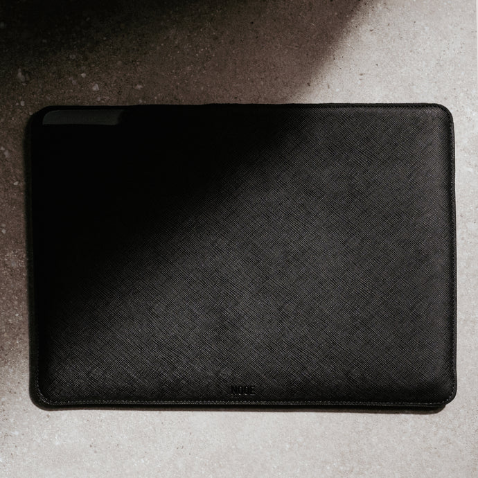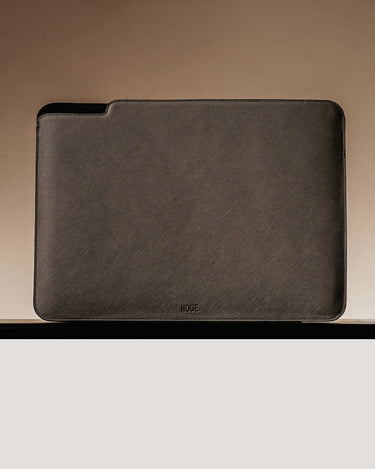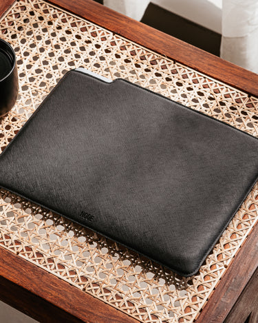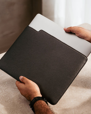 The Archive Laptop Sleeve is crafted from PU cross-grain leather, paired with a herringbone black cotton lining for both durability and a sleek, premium feel.