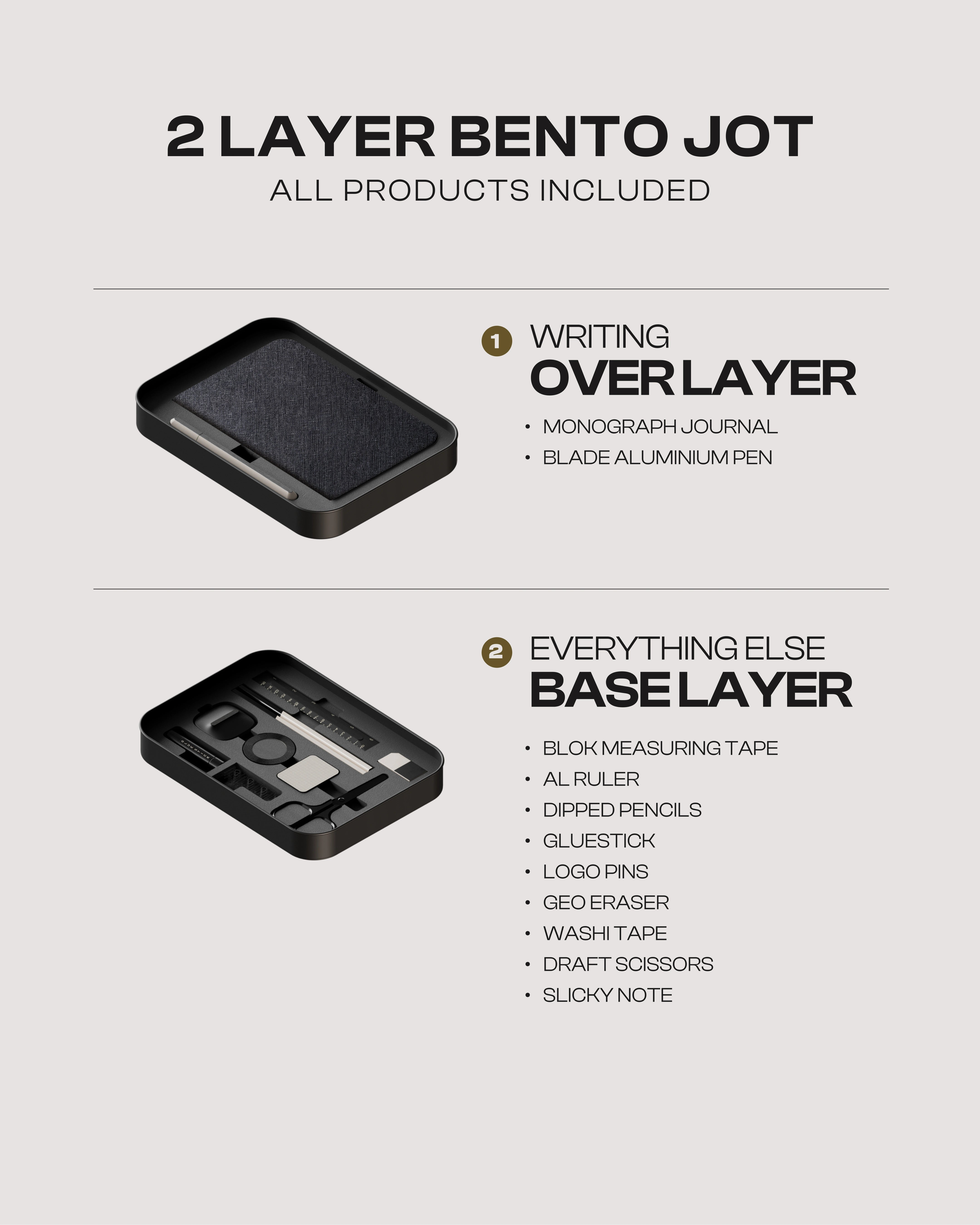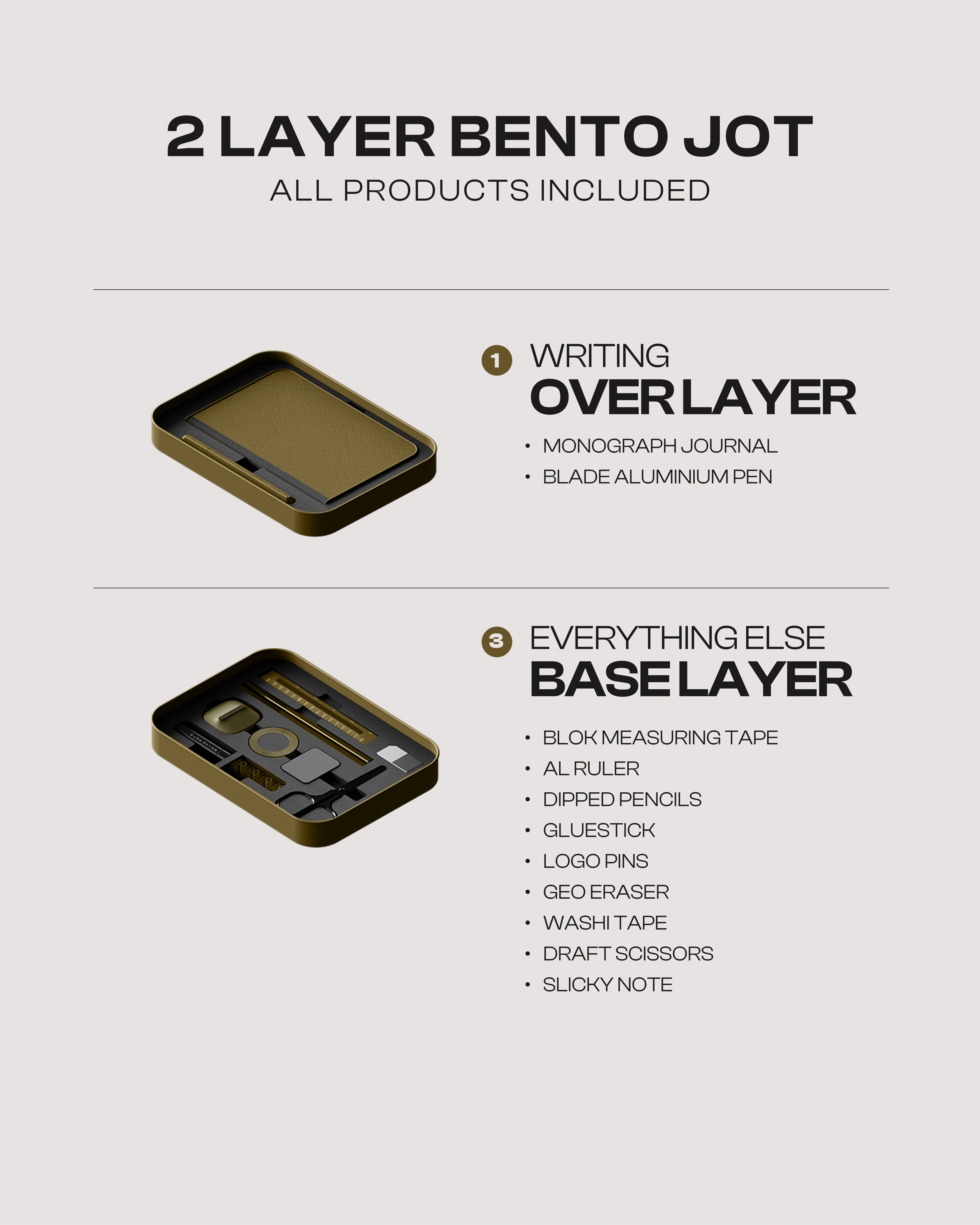 The Bento Jot is our love letter to stationery. Bento Jot is a stationery set; stacked like a bento box with different stationery items, all exquisitely designed with exceptional materials.