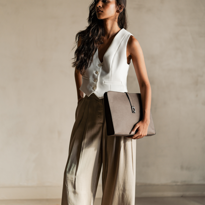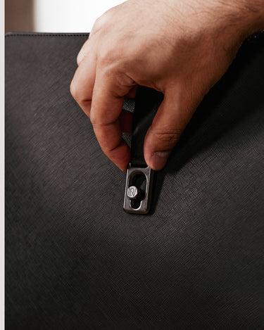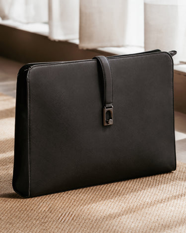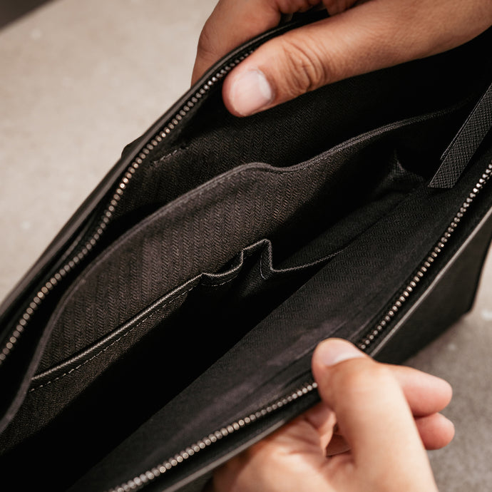 The exterior is crafted from Saffiano Vegan Leather for a premium look, while the interior features a durable herringbone black cotton lining.