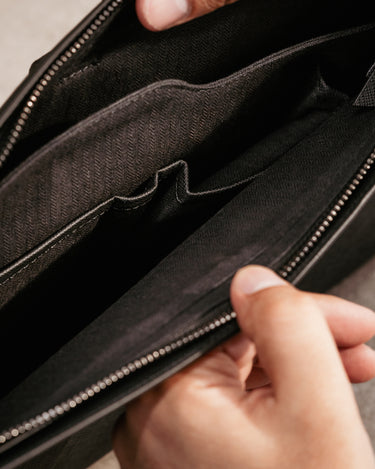 Saffiano Vegan Leather (Exterior) with Herringbone black cotton lining.