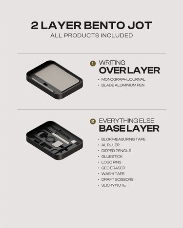 The Bento Jot is our love letter to stationery. Bento Jot is a stationery set; stacked like a bento box with different stationery items, all exquisitely designed with exceptional materials.